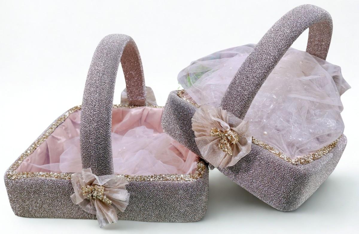 A luxurious round basket finished with textured fabric, pearl-gold accents, and floral embellishments. Perfect for curating festive or wedding hampers with elegance.