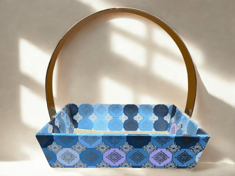 A charming and versatile basket designed for elegant gifting and festive hampers. Crafted from durable wood with a pastel mosaic print and finished with a golden handle, it offers the perfect blend of strength and style. Spacious enough to hold chocolates, dry fruits, candles, or wedding favors, this basket makes gifting both practical and beautiful. Reusable and sturdy, it’s a thoughtful choice for Diwali, bridal hampers, or any celebration.